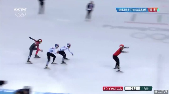 半决赛第一组,比赛中出现了插曲,由于冰面上出现刀片,武大靖多滑了两圈半被召回,最后武大靖以40.087秒获得小组第一进入A组决赛!
