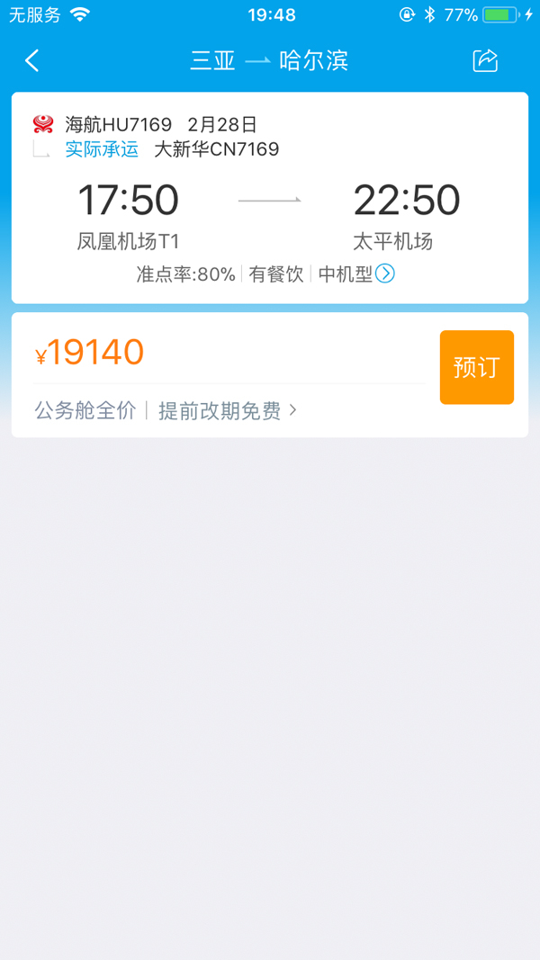 2月22日下午5时许,即便是选择更为昂贵的公务/头等舱,2月23日至27日三亚飞往哈尔滨的机票也均已售完。2月22日早些时候可查询到,在2月23日和2月26日三亚飞哈尔滨的公务/头等舱中,曾出现过最低售价为8850元和11040元的机票出售。进入2月28日,若选择直飞航班,公务舱全价为19140元。