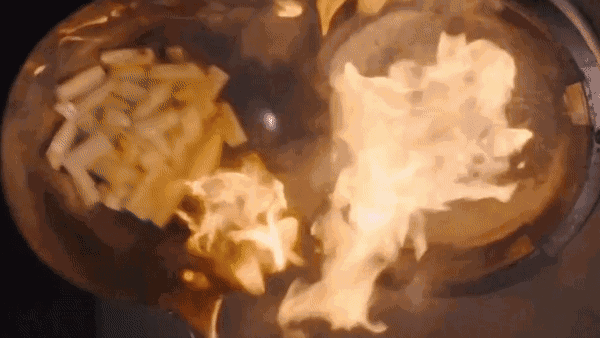 操作此项技艺时锅底温度需在600℃~800℃,锅内温度达200℃,花打四门,飞火炒菜,前后左右,菜随瓢走,大开大合,火焰磅礴,“花打四门”代表了陕菜厨师和陕菜的精气神。