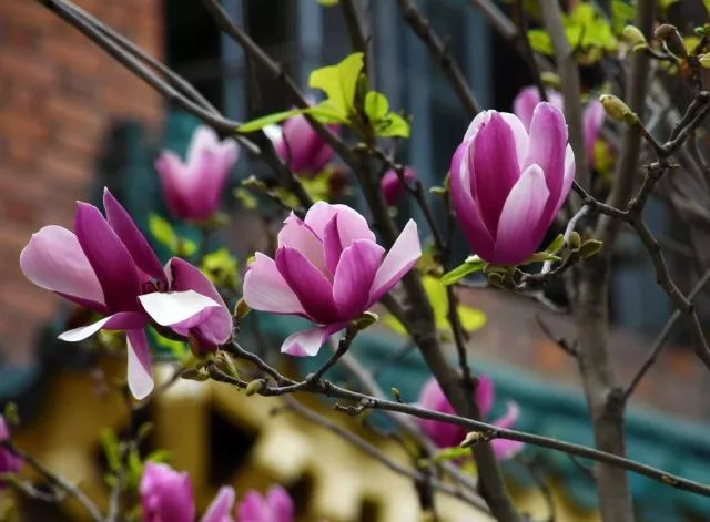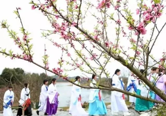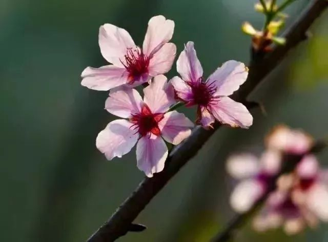 绽放的花朵一簇簇地开在挺拔的桃枝上,