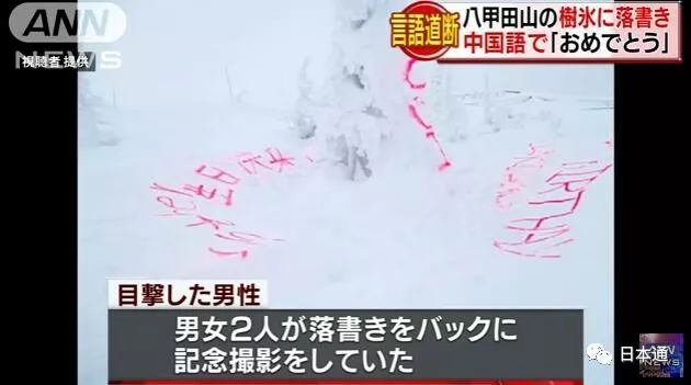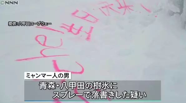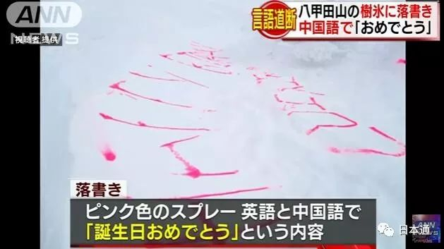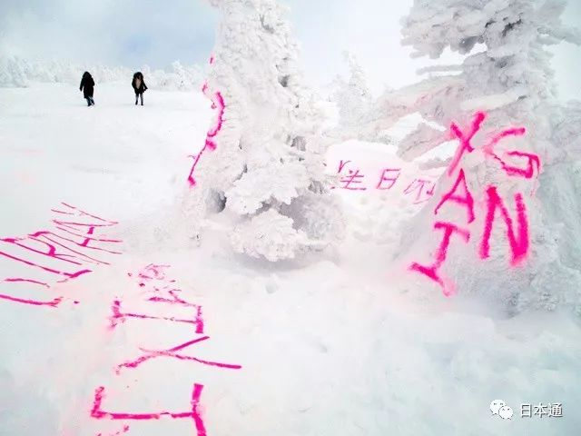 据日本NHK新闻和《朝日新闻》报道,上月14日,在日本青森县八甲田山索道的山顶公园站附近,知名景观“树冰”及其周边被发现有游客用大量粉色荧光喷漆涂鸦,现场留下了用英文和中文喷写的“生日快乐”。