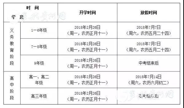 全省中小学2017年度第二学期1-9年级、高一至高三年级均于2月26日(下周一)开学,其中1-8年级于7月7日放假;9年级于中考后放假;高一、高二年级于7月14日放假;高三年级于高考后放假。