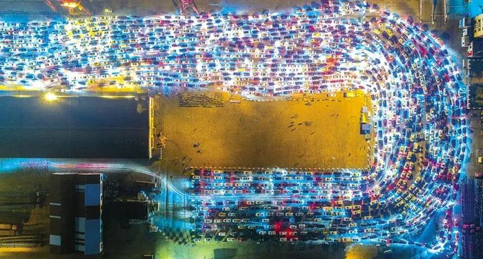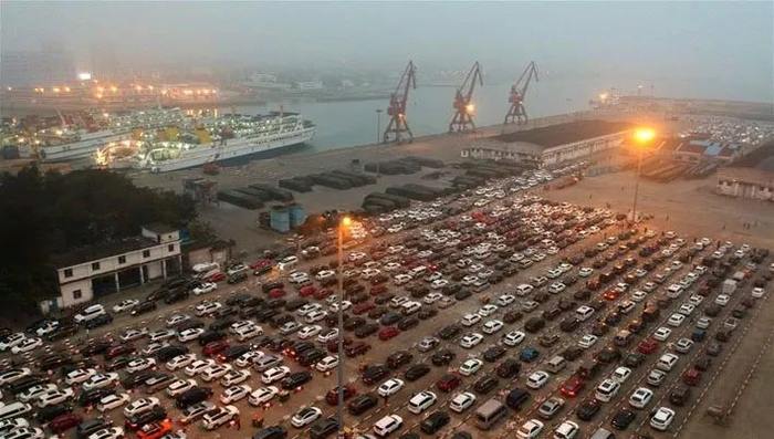 海口秀英港码头,大量滞留车辆排成长龙等待乘渡船离港