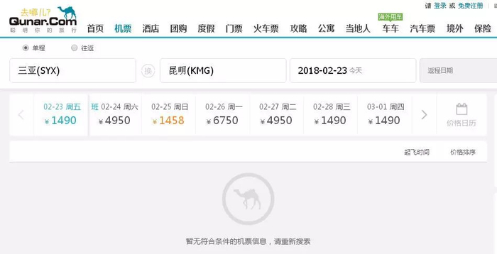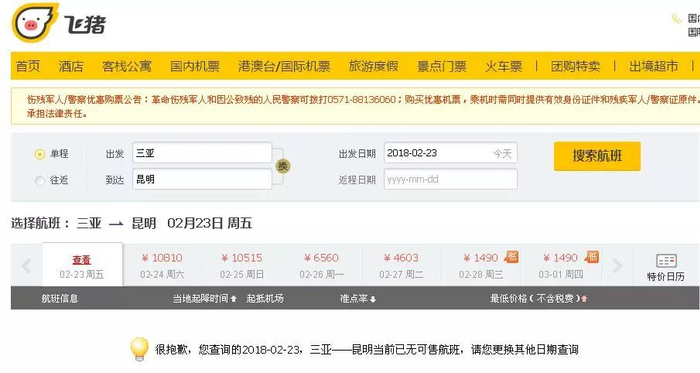 携程网、飞猪网、去哪儿网三亚至昆明23日的机票已卖完