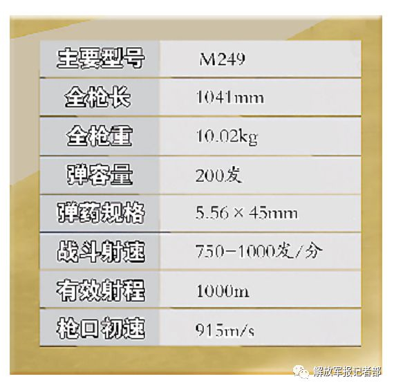M249班用自动武器是比利时FN公司“米尼米”(Minimi)机枪的美国版。相对FN公司的“米尼米”轻机枪来说,M249具有更强的可靠性和更强的火力,使用装有200发弹链供弹,作战中出现缺乏弹药的紧急情况时,可使用M16步枪或M4步枪的弹夹进行射击。该枪配有可折叠式两脚架,并可以调整长度,也可以换用三脚架。此外,M249采用新的液压气动后坐缓冲器,可以减小后坐力设有旋转式气体调节器,适用于不同的射击环境。