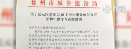 纪元的研究生专业是“比较文学与世界文学”,徐州市招聘专业要求中列的专业是“中国语言文学”等6个具体专业。江苏师范大学研究生院为她开具了一份证明:纪元所学专业为教育部认定的“中国语言文学”一级学科下属的硕士二级专业方向。