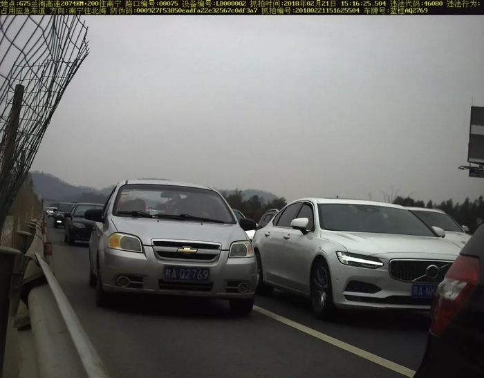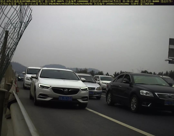 为此,广西公安厅交警总队高速公路管理支队重拳出击,在春节长假期间,在G65包茂高速桂林绕城段、G72泉南高速公路桂林到南宁段、G75线兰海高速公路南宁至北海段、G80广昆高速南宁到贵港段、S31线三北高速合浦往北海段等高速公路路段,采取多种手段严厉打击占用应急车道违法行为。至2月21日,广西公安厅交警总队高速公路管理支队共查处侵占应急车道违法行为1015起(文末附详细名单)。