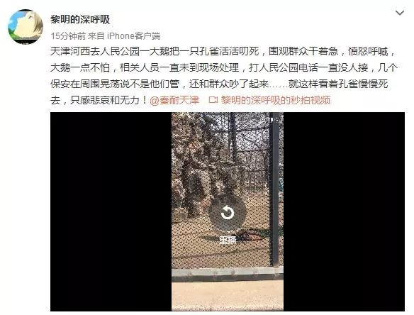 今天在它的攻击下,天津人民公园里一只美丽的孔雀失去了生命。