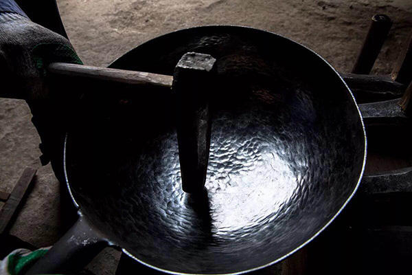 ↑手工匠人正在制作铁锅。