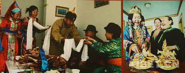 蒙古族过年,人人身着新装,骏马佩上红缨和新鞍。把放有哈达的整只牛羊献给至亲好友。除夕夜要吃“手抓肉”以示阖家团圆。