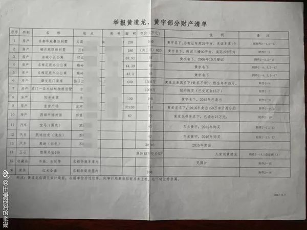 黄道龙、黄宇部分财产清单 微博@王燕茹实名举报 图
