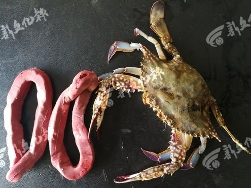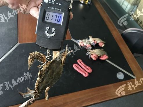 【注:因记者购买飞蟹称重时,袋子内被螃蟹带进去一部分水,但记者在称重时,是将蟹和胶皮绳单独拿出称重,加上胶皮绳内水分的流失,导致购买时的重量和称重时的重量会有误差,两次称得的重量虽然不同,但胶皮绳所占重量比例应基本一致。】