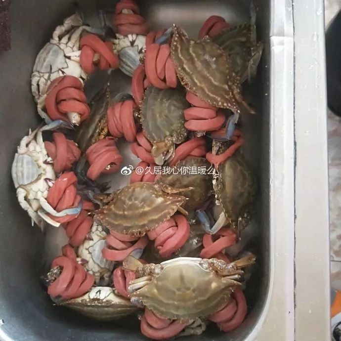 在该网友拍摄的照片上显示,他一共买了15只螃蟹,每只螃蟹的蟹钳部位都缠着很粗的红色胶皮绳。第二张图片是从蟹钳上拆下的胶皮绳,足足装了一个不锈钢盆,该网友最后使用弹簧秤拍摄了胶皮绳的重量,指针显示在4公斤的位置处。