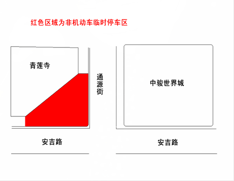 2、 非机动车临时停车区:通源街与安吉路交叉口的青莲寺门前广场设置为非机动车临时停车区,约可允许200部非机动车停放。市民可将电动车、共享单车等非机动车停放在该区后再步行穿过马路进入世界城花灯展区。
