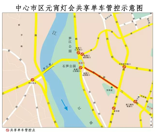 新门街壕沟乾路口、笋江大桥南、新华路西街路口、新华南路新华桥头,临漳门环岛金洲街路口、城西路路口、江滨北路路口采取共享单车交通管控,禁止共享单车进入新门街灯会展区。