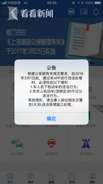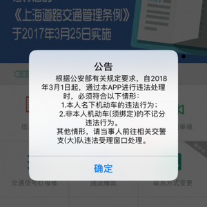 这几天,市民打开“上海交警App”,会跳出一条公告:根据公安部有关规定要求,自2018年3月1日起,通过上海交警APP进行违法处理时,须符合以下情形:1、本人名下机动车的违法行为;2、非本人机动车(须绑定)的不记分违法行为。其他情形,请当事人前往相关交警支、大队违法受理窗口处理。也就是说,自三月一日起,非本人机动车的违法处理,上海交警APP不再受理记分处罚。