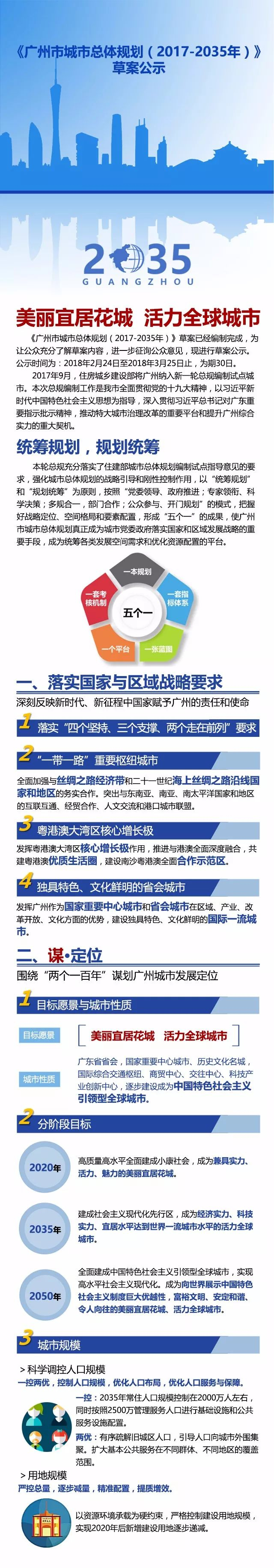 在新时代背景下,广州有了新的定位——“美丽宜居花城、活力全球城市”。新版总规还提出,到2035年广州常住人口规模控制在2000万人左右,主城区珠江两岸60公里滨江漫步道、骑行道、无障碍通道三类通道全线贯通,生态公园数量从现状108处增至138处、形成约1000公里登山健身步道……