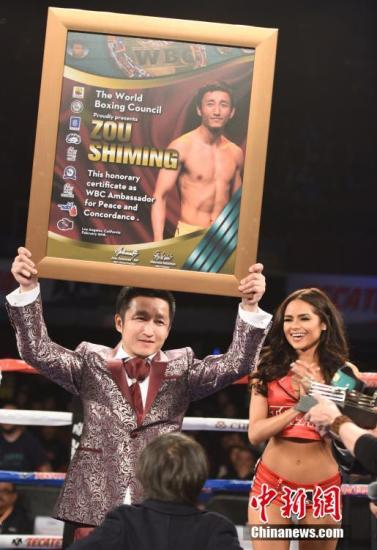 中新社洛杉矶2月25日电 (记者 张朔)当地时间24日傍晚,世界拳击理事会(WBC)在美国洛杉矶向邹市明授予WBC荣誉奖及WBC和平与和谐大使称号,以表彰他在拳击运动领域取得的卓越成就。
