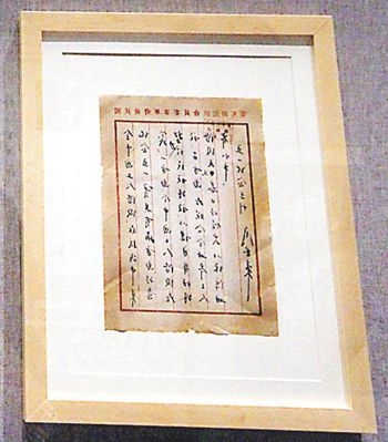 在陈列中,有一张贴在周恩来总理办公室门上、下面有赵炜等工作人员签名的大字报引起了观众们的注意。周恩来卫士、中央警卫局原副局长高振普现场向观众讲述了这张大字报背后鲜为人知的故事。原来,大家看周总理工作太辛苦,不注意休息,便贴了这张大字报进行劝阻,要求周总理改变工作习惯、加强休息。周总理认真读过后,写下了几个大字:“诚恳接受、要看实践。”