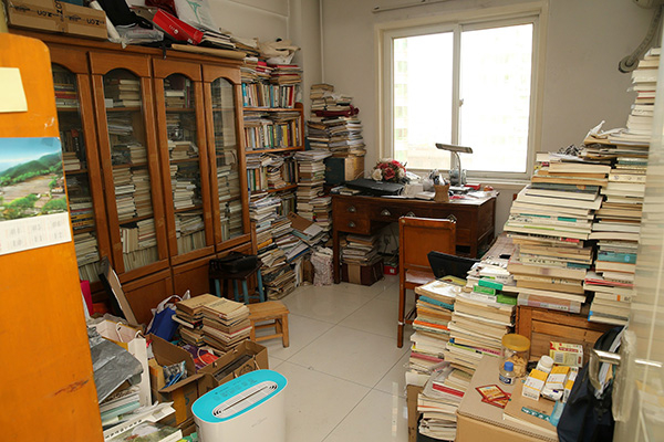 十多年来,红柯一直居住在陕西师范大学的家属住宅中,偌大的家里最多的是书,客厅四个三门大书柜均已塞满,书柜旁边的地板上也堆满了书,书房里的书更多,只有一张书桌和一把椅子的容身之地。这些书大半是文学作品,还有大量的历史、地理、民族、艺术、哲学等类别。