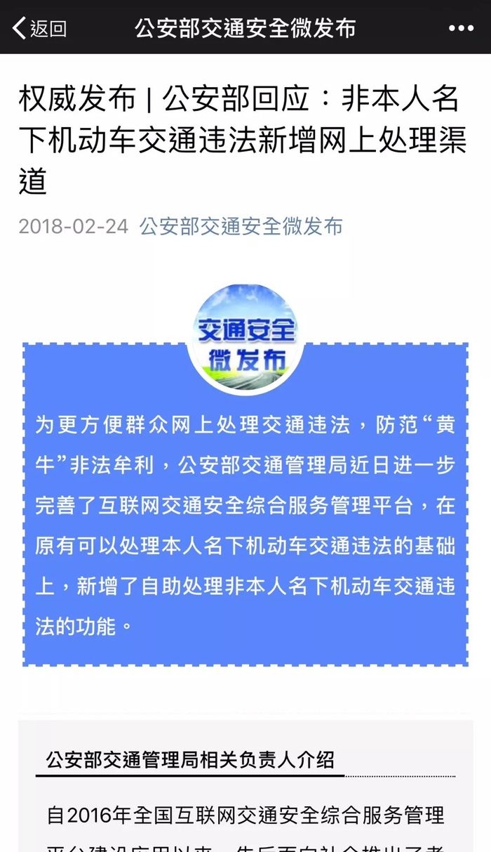 2月24日,“公安部交通安全微发布”公众号发布《公安部回应:非本人名下机动车违法新增网上处理渠道》,12123APP新增了绑定非本人名下机动车并处理交通违法的功能,更加方便驾驶人处理交通违法。驾驶人既可以在交通违法处理窗口处理交通违法行为,也可以通过12123APP足不出户自助处理。这里, “面签”和“绑定”非必选项,市民可自主选择。