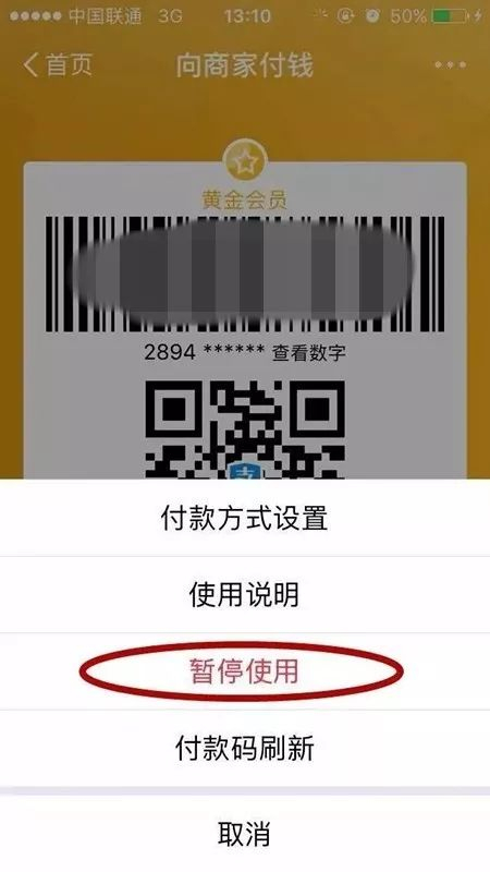 【第二步】:点击“暂停使用”,你的付款码就会暂时失效,