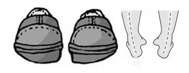 正常人步行,呈轻度外八字形,鞋跟都会有或多或少的磨损,磨损位置集中于后跟外侧,且对称。