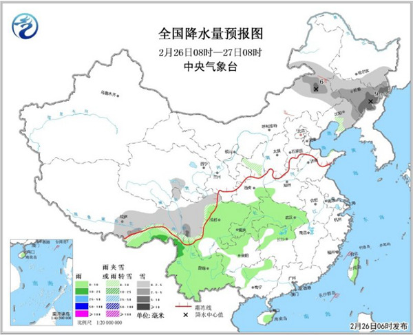 中国天气网讯 预计今起(26日)三天,大范围雨雪过程将影响我国。其中,内蒙古东部、东北今天有小到中雪,局地大雪;明天南方降水明显,江汉、江淮、江南大部有中到大雨。正值春运返程,公众出行请注意交通安全。3月初,新一轮雨雪将无缝对接,本周南方雨水频繁,阳光稀缺,需注意防范连续阴雨天气的不利影响。