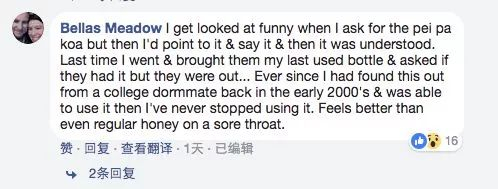 “每次我在中国药店说我要枇杷膏的时候,他们都听不懂我说啥!我只能指出来。但是在上次,我又去买的时候,他们告诉我已经售罄了。从2000年左右我第一次试过了枇杷膏之后,我就根本停不下来了!这个比蜂蜜缓解咳嗽的效果要好很多。”