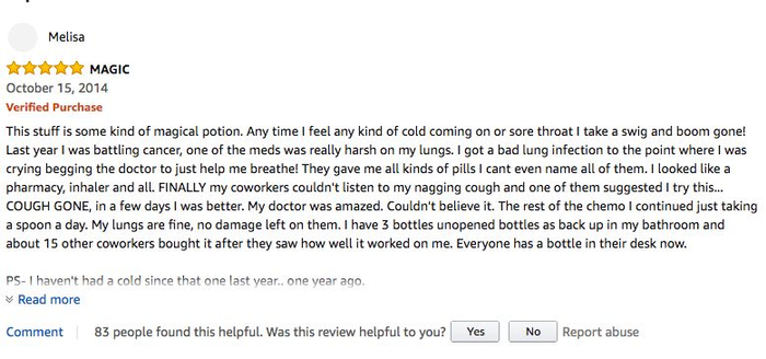“这玩意儿就是仙丹!每次我感冒或者喉咙痛,我都会吃它。去年的时候我还在和癌症作斗争,在当时,我的肺部遭到了感染,甚至我的呼吸都非常困难。我无数次祈求医生帮助我,吃了无数的药后,我家里简直要变成了药方,但是完全没效果。最终,和我一起工作的同事实在受不了我天天咳嗽了,他最终推荐我吃了枇杷膏。结果!我竟然好了!!我的医生都难以相信!在那之后,我依然每天坚持喝一勺,我的肺最终完全好了!现在我的家里还屯着三瓶!我的同事们在看到我的效果如此之后,也都纷纷购买。”