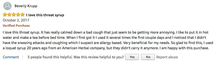 “我太爱这个糖浆啦!它真的可以缓解我的咳嗽,我喜欢把它化在热水中喝,或者用它泡茶,我第一次用它的时候就发现,喝了它之后我就不打喷嚏也不咳嗽啦,非常适合我哦。很开心找到这个灵丹妙药。感恩让我遇见它!”