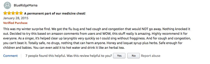 “这简直是我的冬日大惊喜!今年冬天我感冒了,然后引发了很严重的咳嗽,一直好不了。买了各种药吃但是无济于事,之所以买枇杷膏是看到亚马逊上这么多人的好评。到货之后,简直棒呆!推荐给所有人,作为一个歌手,它可以帮我润喉清嗓,让我的歌声更加清亮。它的成分完全健康,没有任何的依赖物质,不会伤害你的身体。蜂蜜枇杷和草药,对小宝宝们也同样安全。你甚至可以冲热水泡它,就会变成一杯敲好喝的香草茶哦。”