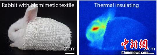 “这说明小兔子体表的温度被锁在了‘毛衣’里,红外相机无法捕捉到流失的热量。”柏浩解释说,与天然北极熊毛27的导热率相比,该材料导热率最低为19,隔热性能更好。