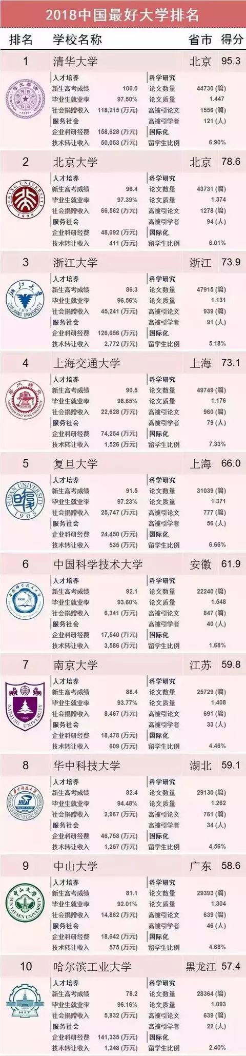 最新发布的2018“中国最好大学排名”,除我国港澳台地区外的实力最强的600所内地大学“排排坐”,清华大学(分数线,专业设置)、北京大学(分数线,专业设置)、浙江大学位列前三,上海交通大学(分数线,专业设置)、复旦大学(分数线,专业设置)、中国科学技术大学、南京大学、华中科技大学、中山大学、哈尔滨工业大学(分数线,专业设置)依次排在4到10名。地方高校中表现最好的三所大学分别是苏州大学(27名)、上海大学(41名)和南方科技大学(43名)。