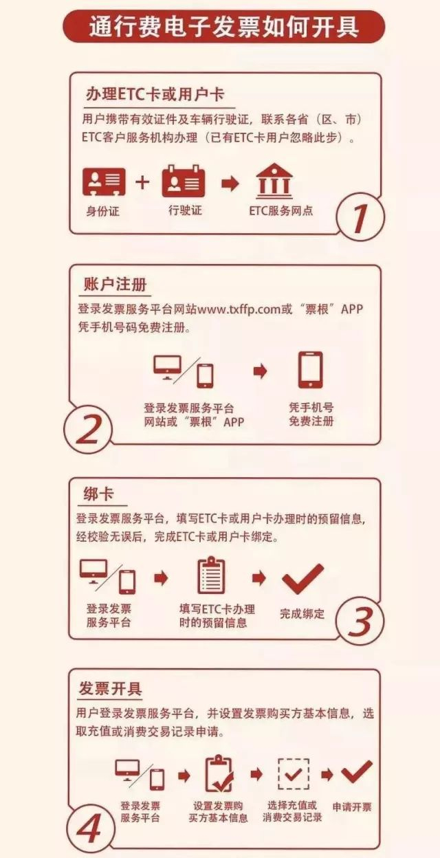 2017年12月25日起,发票服务平台注册及绑卡功能正式上线。2018年1月1日以后使用ETC卡或用户卡交纳的通行费,以及ETC卡充值费可以开具通行费电子发票,不再开具纸质票据。