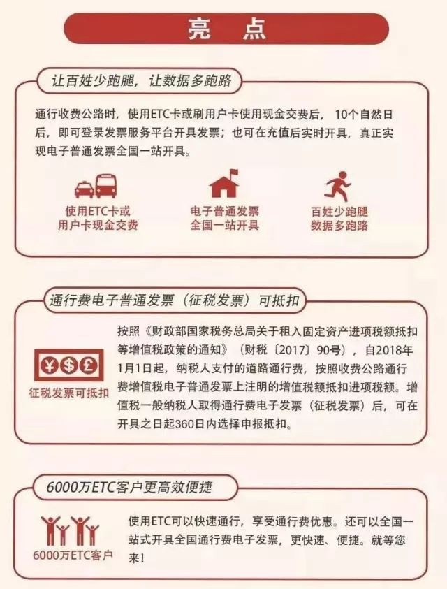 从1月1日起,全国收费公路通行费增值税电子发票正式上线,以后使用ETC卡或用户卡交纳的通行费,以及ETC卡充值费可以开具通行费电子发票,不再开具纸质票据。