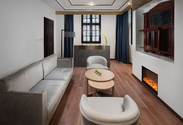 整个酒店你从外面看只能看到灰色得灰砖,为了尽可能还原扬州古城的历史感,酒店外墙选用了竹木和一百到三百年不等历史的灰砖,让具有记忆属性的材料有了现代方式的演绎。
