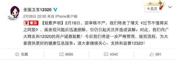 2月18日,因审核不严,我们转发了博文《过节不值得买之阿胶》,虽发现问题后迅速删除,但仍引起关注并造成误解。