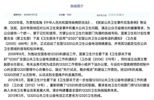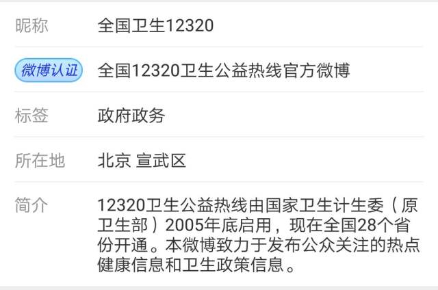据微博页面显示,12320卫生公益热线由国家卫生计生委(原卫生部)2005年底启用,@全国卫生12320致力于发布公众关注的热点健康信息和卫生政策信息。