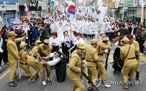 韩国民众纪念独立运动 大妈自导自演:痛打“鬼子”到集体下跪…