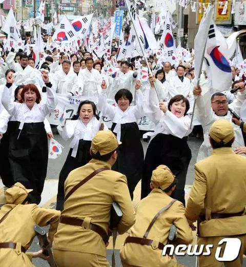 当地时间28日,为庆祝“三一节”的到来,1000多名韩国釜山市民身着韩服,手举太极旗走上街头,重现当年抗议日本殖民统治、发起宣告独立的景象。其中有韩国民众扮演日本宪兵,试图阻拦游行队伍但遭到大妈们的呵斥,最后“鬼子们”被痛打到集体下跪。