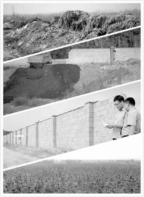 图片从上至下依次为:曾经触目惊心的垃圾山;神秘卡车倾倒黑色泥浆;检察官利用无人机勘查取证;如今生机盎然的黑松林