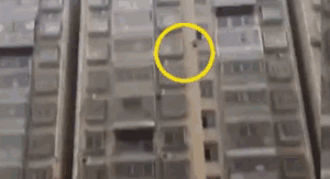 未等消防员准备好绳降,女孩突然从楼上坠落,幸运的是女孩刚好掉在救生气垫上,随即获救。