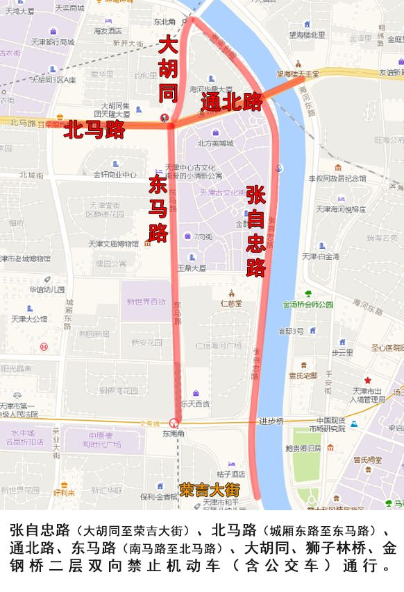 海河东路、金钟桥大街、南运河南路(金钟桥大街至金华桥道路北侧泊位除外)、张自忠路(金刚桥至荣吉大街)、张自忠路上浮段(通北路至水阁大街)、水阁大街、南马路、东马路、北马路、通北路、大胡同、城厢中路、城厢东路、南门外大街(南马路至福安大街)。
