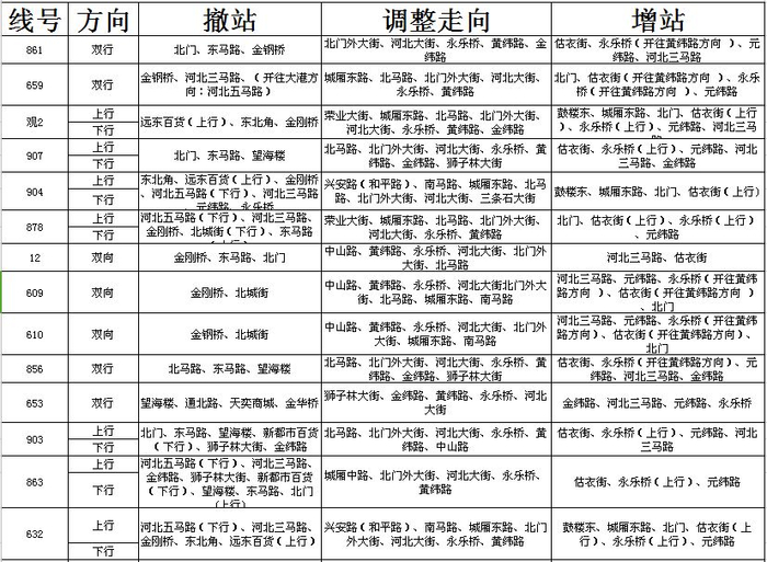 603路:撤销新华道、龙华里站,增设青云里、西青医院、柳霞路站。669路:撤销新华道、龙华里、柳霞路站,增设青云里、西青医院站。672路:撤销新华道、龙华里、西青烈士陵园、柳兰花苑站,增设青云里、西青医院、轻工职业学院、丰田发动机厂站。