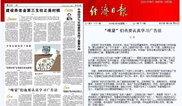 而在2月26日《经济日报》刊发了一篇评论,标题为《“咪蒙”们也要认真学习广告法》,里面就说到了工商总局对新媒体账户的界定,是指有一定影响力的微信公众号、微博账号,其中就包括了“咪蒙”等自媒体大V们。