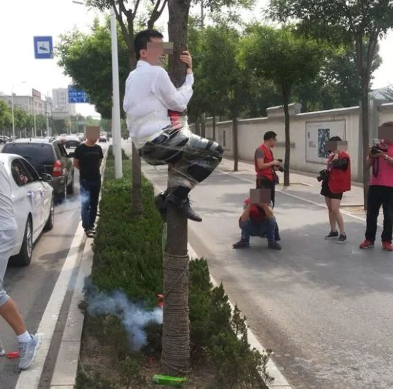 山东淄博,新郎被捆在路边大树上,现场新郎脸上被涂抹牙膏、屁股上燃放鞭炮。