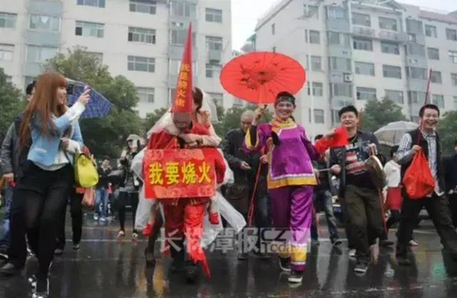 四川、湖南部分地区的婚礼,很多公公要带上高帽,脸上被涂上碳墨,背着儿媳游街示众。
