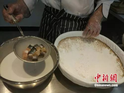 于伯军将馅料沾上水,准备投进盛满糯米粉的笸箩内摇。中新网 李金磊 摄
