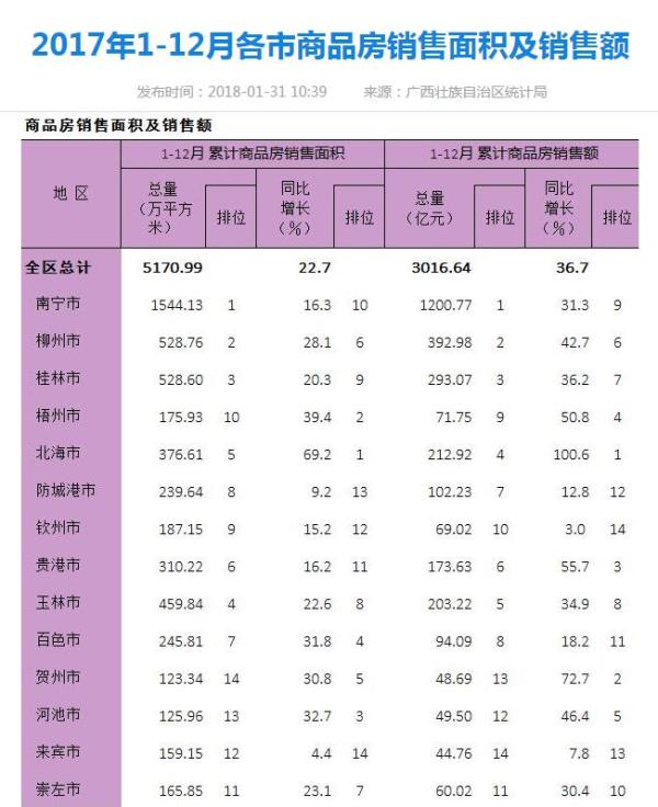 2017年广西楼市受供需两旺的影响,成交量始终保持高位运行态势。据广西统计局1月底公布的数据,全年全区房地产开发投资2683.48亿元,比上年增长11.9%,其中住宅投资增长7.3%。增速比全国平均水平(7.0%)高4.9个百分点,在全国排名第9位,西部排名第3位,广西房地产开发投资增速全年呈现从高开到平稳的走势。